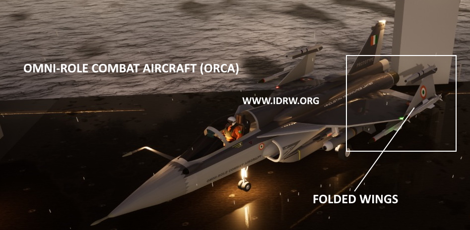 5) Folded Wings: ORCA which is primarily designed for the Indian Navy will feature folding wing configuration which helps the aircraft to occupy less space in a confined hangar of the aircraft carrier thus also reducing the footprint of the aircraft when parked on the flight deck or inside the hangar. A folding wing has some disadvantages compared to a fixed-wing. It is heavier and has more complex due to connections for electrical, fuel, aerodynamic and structural systems. In Renders, we can see both ORCA in the fixed-wing configuration for Air force and folding wing configuration fo the Navy.