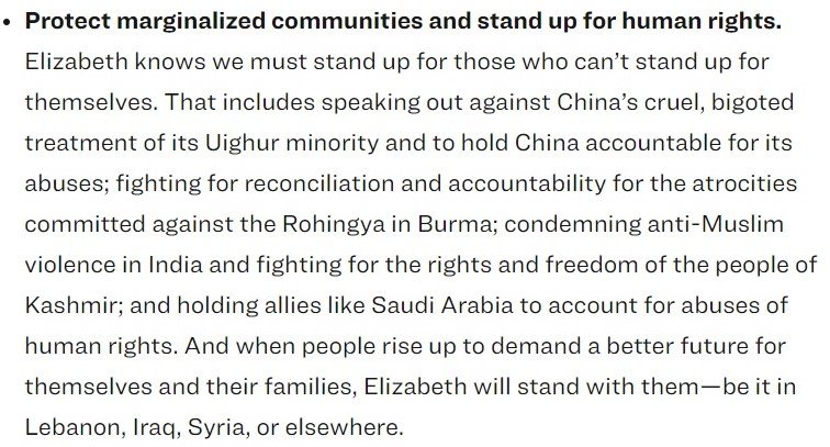 Elizabeth Warren said in her plan, “Elizabeth knows we must stand up for those who can’t stand up for themselves. That includes speaking out against China’s cruel, bigoted treatment of its Uighur minority and to hold China accountable for its abuses; fighting for reconciliation and accountability for the atrocities committed against the Rohingya in Burma; condemning anti-Muslim violence in India and fighting for the rights and freedom of the people of Kashmir; and holding allies like Saudi Arabia to account for abuses of human rights.” As anyone aware of the nature of Kashmiri separatism knows fully well, it is Jihad that is being waged against India and any support for it is equivalent to supporting Radical Islamic Terrorism.