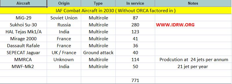 IAF’s current procurement plans involve the purchase of an additional 8 Su-30MKI, 21 Mig-29, 36 Dassault Rafale, 40 Tejas Mk1, and 83 Mk1A along with procurement of 114 jets of International origin. which by 2030 will see the induction of nearly 300 jets plus there will be room for nearly 100 MWF-Mk2 which is already under development and it is expected to enter production by 2026 and could have produced at least 50 jets by 2030.